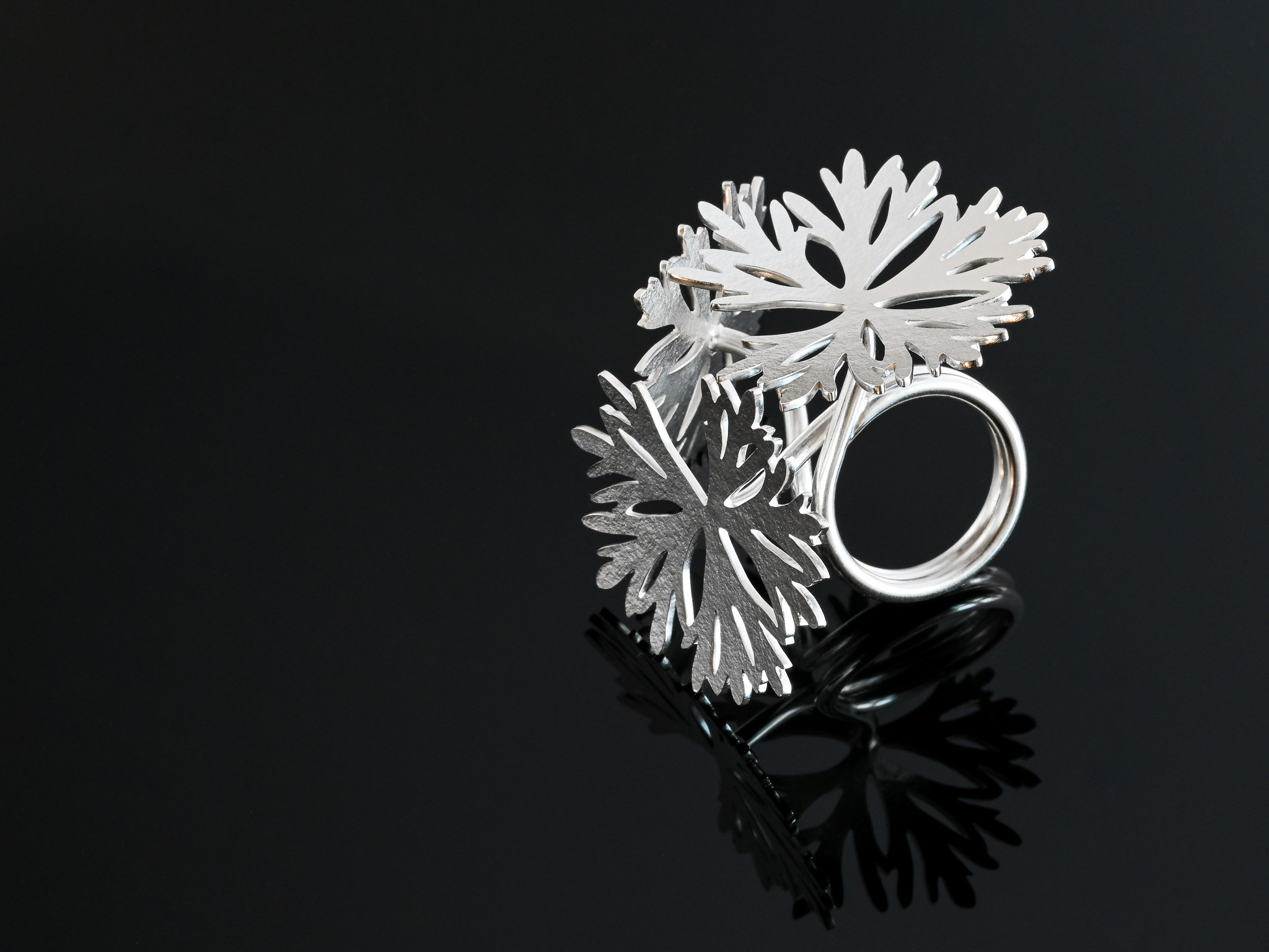Jag använder silver och andra metaller för att ge form åt det jag ser i naturen. Genom växterna vill jag ibland berätta något om oss människor. Både ogräs från dikeskanterna och blommor från trädgården är för mig lika intressanta. De blir till smycken och objekt där hantverket får bära historierna vidare.